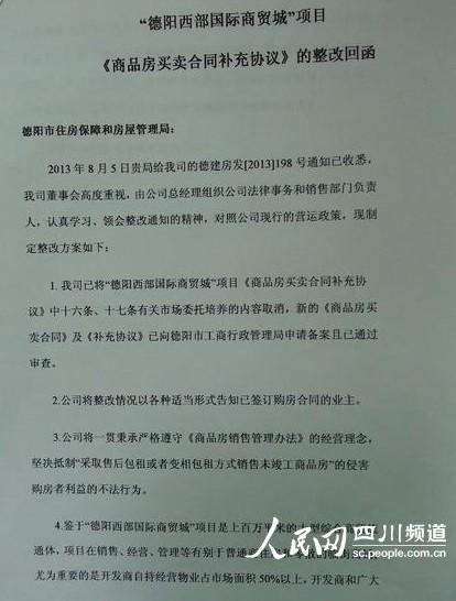 德阳市房管局向记者提供了“德阳西部国际商贸城”项目《商品房买卖合同补充协议》的整改回函。回函的落款日期为8月14日。 回函写到:我司已将“德阳西部国际商贸城”项目《商品房买卖合同补充协议》中十六条、十七条有关市场委托培养的内容取消,新的《商品房买卖合同补充》及 《补充协议》已向德阳市工商行政管理局申请备案且已通过审查。……公司将秉承严格遵守《商品房销售管理办法》的经营理念,坚决抵制“采取售后包租或者变相 售后包租方式销售未竣工商品房”的侵害购房者利益的不法行为。