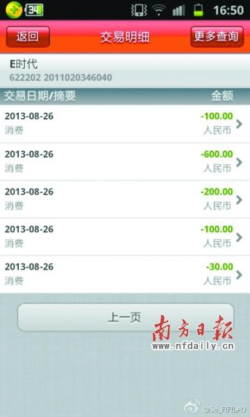 而这笔钱转到了刘小姐的工商银行账户后不久,刘小姐发现了6笔共计1130元的支出记录。27日,刘小姐就此事到其开户行、中国工商银行孙文支行了解情况。记者在一张中国工商银行提供的“查询账户明细”单上看到,26日,该银行卡分别出现了100、100、600、200、100、30元的支出记录。根据其网上银行账户显示的“交易明细”信息,这6笔支出的“交易场所”显示为支付宝(中国)网络技术有限公司成都分公司。