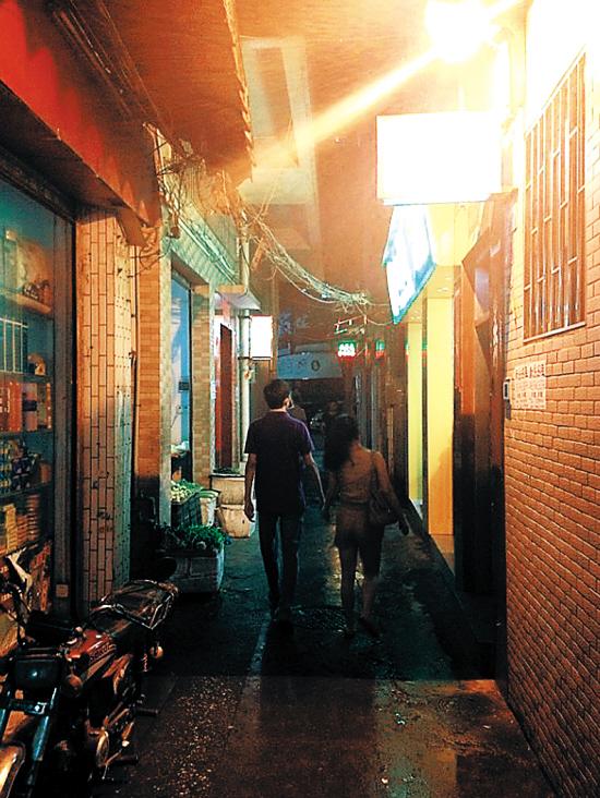 夜里的城中村,很多相互依偎的男女走过 羊城晚报记者 郑诚 摄