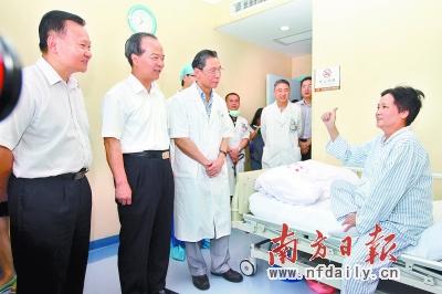 昨日,在广州医科大学第一附属医院广州呼吸疾病研究所,呼吸三科2707病房,广东首例H7N9禽流感患者陈女士紧紧握住副省长林少春的手,连连道谢:“谢谢你们,把我的命捡回来!”