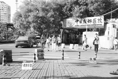 北京中日医院门前的人行道上,十多个非法中介将出租家庭旅馆的小广告牌放在出入医院的大门前。医院管理人员说,这种情况已经有许多年了,租房的患者和家属很多,房子大多在医院周边500米内的小区里。图为放置在医院一号门前的出租房小广告。