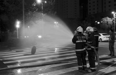 消防人员喷水稀释泄漏天然气浓度 图片均为通讯员 崔永奇 摄