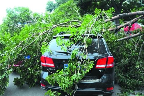 民警来到现场后发现,路边一棵大树的一个粗枝干断裂倒地,方向正好是朝着马路,两辆正在等红灯的轿车不幸被断裂的枝干压砸在下面。“我们到的时候,就发现这一带已经出现了拥堵,因为倒下的树枝占据的面积很大,足足占了3个车道。”民警告诉记者,此时又正值中午高峰,严重影响车辆通行。