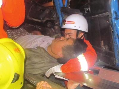 9月8日凌晨1时许,北滨河路白塔山公园附近,由西向东行驶的两辆拉砖卡车发生追尾,后面车的司机被困在驾驶室里。接到报警后,盐场消防中队赶到现场,对驾驶室进行破拆。由于司机两只脚被卡住,消防官兵钻进车内把障碍物搬开,一点一点把驾驶员的脚抽了出来。半个小时后,被困司机获救被送往医院。