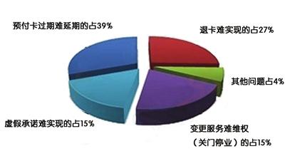 预付卡消费纠纷是12315指挥中心服务类诉求来电的热点之一。仅今年上半年,12315指挥中心共接听涉及预付卡消费方面的来电176件,申诉量占服务类申诉的3.1%。主要包括购物卡、美容美发卡、健身卡、洗衣卡、洗车卡等预付卡形式的消费。其中:预付卡过期难延期的占39%、退卡难实现的占27%、虚假承诺难实现的占15%、变更服务难维权(关门停业)的占15%、其他问题占4%。