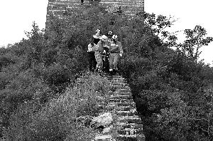 10分钟、20分钟……当救援人员爬上了山顶长城,穿过了几个小烽火台后,突然听到从附近传来了急促的“help,help(救命)”呼救声,只见远处有几个身影在晃动,进行搜救的消防员立即加快前进步伐,终于找到了受伤的外国游客。