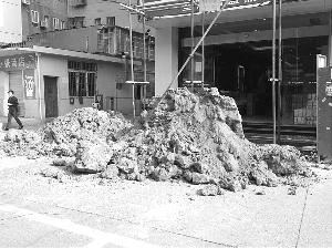 记者在现场看到,渣土足足有一人高,有20余立方。店铺的顾客门可罗雀。从门口走过的路人都踮着脚走过,或绕行车道才能通过,给行人带来了不便和安全隐患。