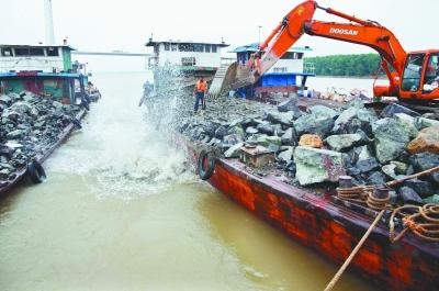长江大胜关段河段水深流急,是历年防汛的险工险段。日前为消除水下险情,确保长江大堤稳定,一场大规模水下护岸加固工程由此展开(如图 本报记者 吴彬摄)。