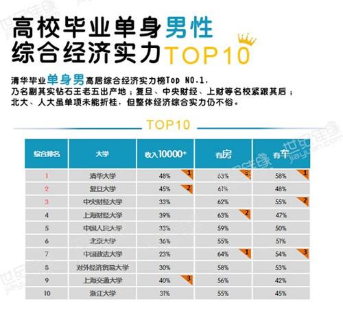 根据调查报告显示,毕业单身男性收入过万的排名前三的高校分别为清华大学(48%)、复旦大学(45%)、上海交通大学(40%)。有房的排名前三的分别为中共政法大学(64%)、上海财经大学(63%)、清华大学(63%)。有车的排名前三的分别为清华大学(53%)、中央财经大学(55%)、中国政法大学(54%)。清华大学毕业单身男高居综合经济实力排行榜NO.1,乃名副其实的钻石王老五盛产地。北京大学、中国人民大学虽单项未能折佳,但整体经济实力不俗。