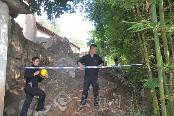 昨日7时10分,因连日来的强降雨,华宁县青龙镇落梅村委会牙口村和矣马白村委会上营村居民住房前的土地严重开裂,突发山体滑坡,严重威胁房屋地基。泥石滑至村民房屋墙脚,甚至有的房屋走廊地面因土层挤压产生凸起的状况,房屋存在随时可能倒塌危险,村民生命财产安全受到严重威胁。