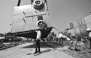 “上卡子!”制造商双良锅炉的项目经理王明卫一声令下,几位工作人员立即拿起气割枪,开始在锅炉的四个底角钻孔。“锅炉重70吨,必须得焊上U形的卡子,再吊钢绳,确保安全。”