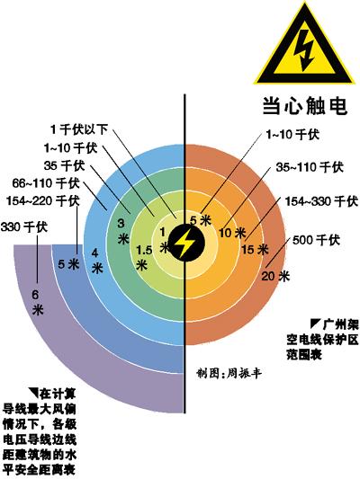 广州供电局相关负责人介绍道,按照《电力设施保护条例实施细则》,高压线距建筑物的水平安全距离为1.5米起,其中110千伏为4米,220千伏为5米,500千伏为8.5米。