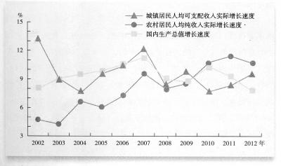 2002~2012年我国城镇居民人均可支配收入实际增长速度、农村居民人均纯收入实际增长速度、国内生产总值增长速度对比图。