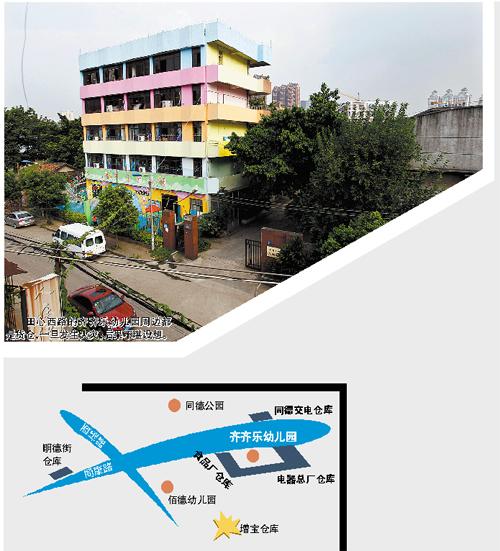 令街坊最担忧的是处于仓库包围中的幼儿园。“一出意外,孩子们怎么逃生?”记者发现齐齐乐幼儿园位于田心西路202号,其西侧是远华日用品电器总厂,幼儿园后面的游乐场与该厂仅相隔一道铁栏,几步之外就是储存大量电器的仓库;东侧是一家酒类专卖公司和食品公司的仓库;北侧隔着一条街的是同德交电仓。