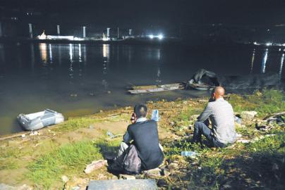11日晚,搜救人员撤离后,失踪者家属在江边不愿离去。