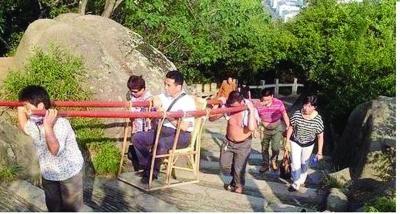 记者发现,很多顾客在轿子停放处咨询,正在休息的轿夫们热情地介绍起来。据了解,这些轿夫的生意很不错,而光顾的多是一些年轻人。然而,形成鲜明对比的是,抬轿的轿夫却多为年纪大的,年纪最轻的也要接近50岁,其中就有50多岁的妇女。年龄最大的轿夫竟然是一位81岁的老人。一位年纪接近60岁的轿夫告诉记者,抬轿上山的确辛苦,尤其是大热天的,一个来回身上穿的衣服几乎全湿透。但由于收入不错,他们吃苦也习惯了,这份苦差年轻人肯定不愿意做的。