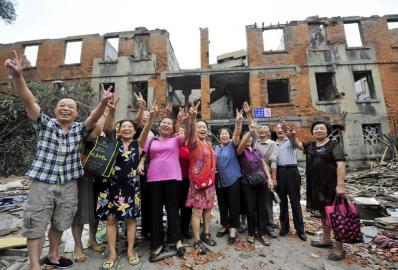 老住户在拆迁楼前合影留念。