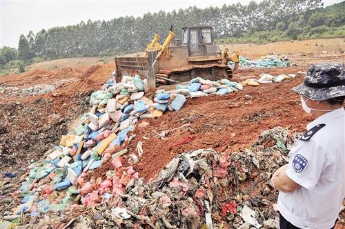 昨日,随着执法人员一声令下,推土机对堆放在城南垃圾填埋厂的走私冻品进行推坑填埋。据了解,南宁警方和商务执法部门在今年第三季度联手开展打击食品犯罪专项整治行动中,共缴获410余吨走私冻品,涉案金额达3836万元,嫌疑人均已受到处理。