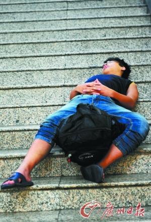 火车东站,一滞留乘客躺在楼梯上睡着了。记者乔军伟 摄