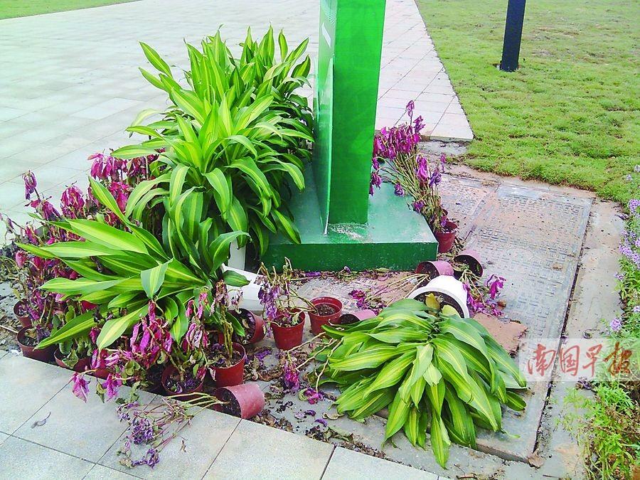 9月23日上午,记者来到位于平乐大道的五象湖公园,这里就是网友所说的园博园。还没入园,首先看到的是路边花圃的一些盆栽东倒西歪,许多花草都已枯萎,防护的石砖则被挖开,随意堆叠。草地上,工人正在铺草皮。一名刚下公交车的老人说,这给他半成品的感觉。