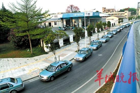 东莞市出租车大多使用天然气,每到交班前后,各加气站都排起长龙