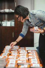 大学生志愿者正在分拣与会人员的铭牌。 郝飞 摄