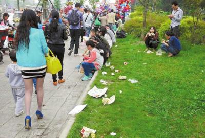 在锦里,护栏上经常可以看到游客吃小吃后留下的木签,公园草从里,游客扔下的卫生纸、包装袋非常醒目;在成都动物园,游客给笼子里的动物也丢去了不少垃圾,一只熊甚至将塑料玩具一口就吞到了肚子里……