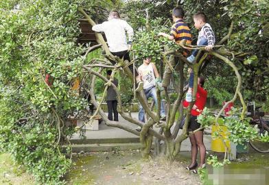 温江某公园内,一群孩子爬到树上玩耍,树枝都被压弯到地上。拍客:taoy稿酬100元