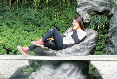 一女孩坐在杜甫石像上。拍客:网中人 稿酬200元