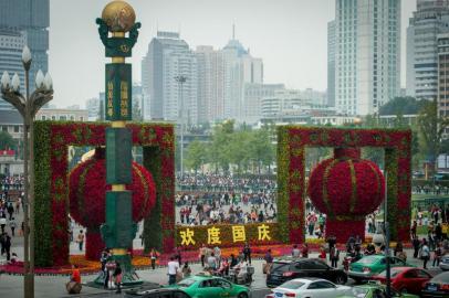 昨天上午9时,天府广场上人潮如织。广场南侧,两个用一品红装扮的巨型花卉灯笼,喜庆美观。灯笼中间的花牌上堆砌出四个黄色大字“欢度国庆”,一拨接一拨的游客在此留影。在广场路口负责协管交通的李阿姨介绍,此前花牌上的字样是“第十二届世界华商大会”,9月28日,园林局的工作人员来将其替换成“欢度国庆”的字样。带老人来留影的孙先生认为,同一批花卉打扮完华商大会,接着装点国庆,物尽其用,很实在。