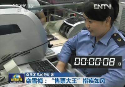 《新闻联播》中栾雪莲仅用14秒时间就卖出一张票。视频截图