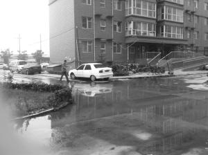 昨日9时许,都市怡景小区内很安静,15、16、17号楼中间一个十字路口处,地面积着一汪水,目测最深处能没过成人脚面,机动车驶过积水处,总会溅起不小的水花。