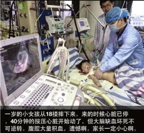 一位知情人发微信称,“女童从18楼摔下时心脏已停,送医后经40分钟的按压,她的心脏又开始动了。但女童大脑缺血坏死不可逆转,腹腔大量积血。”据医院急诊科医生介绍,截至昨晚9点,通过抢救,吴婕的病情仍较严重,现仍在ICU(重症加强护理病房)观察。(以上人物均为化名)