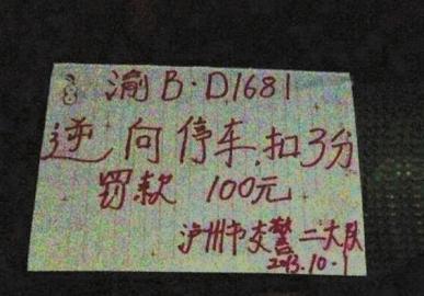 据该网友提供的照片,记者看到该罚单用红笔手写而成,在纸张上歪歪扭扭地写着“逆向停车,扣3分,罚款100元”等字样(如图)。