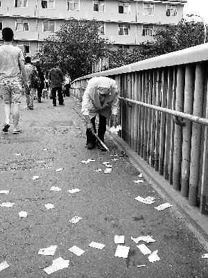 环卫工人李治荣和张彦主要负责从海淀黄庄路口到四通桥之间的小广告清理工作,清理重点是人民大学东门附近的两座过街天桥和之间路面上的小广告。近千米的路段,工作量本应该不太大,但实际上,两人每天都要在早晨4点半到下午5点的工作时间里不停地铲、撕、涂,只因为这些小广告“前脚清完后脚贴”,怎一个“猖狂”了得。