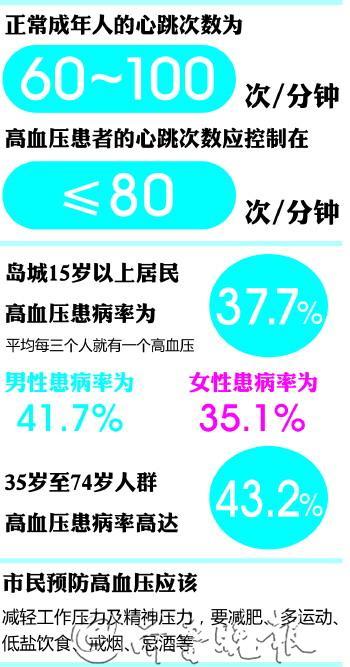 姜先雁称,预防高血压,既要减轻工作压力及精神压力,还要多运动、低盐饮食、戒烟、忌酒等。同时,高血压患者还需要控制心跳。“正常成年人的心跳为60~100次每分钟,而高血压患者的心跳最好能控制在每分钟80次以内。”青岛市高血压防治临床基地、第三人民医院心内科主任张丙印介绍。(记者 杨林 杨帅 制图)