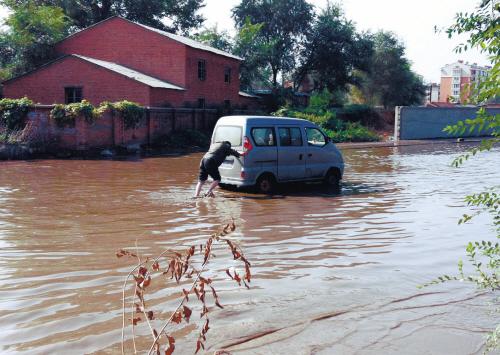 昨天,记者在千山西路华邑世纪城小区西侧看到,积水路段长达二三百米。一些轿车行至此处,不敢涉水调头离开。一辆微型面包车试图通过,结果水中熄火,车上的人无奈只好下车将车推离。