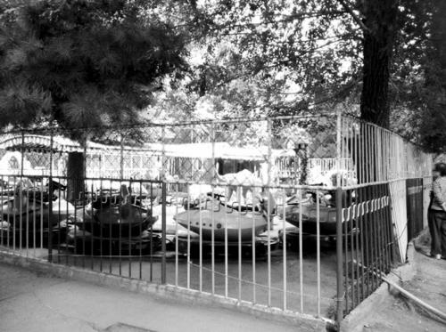 在八一公园西侧,占地数百平,一排排用铁丝网、铁栅栏、塑料棚搭建的建筑格外刺目。走近细瞧,这些建筑之间也由栅栏分隔成一块块独立的空间,里面经营着各式各样的收费项目:碰碰车、小火车、儿童天地、水上乐园、溜冰场……
