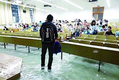 大水漫进了同济大学教室,学生自嘲“同舟共济”。网络图片