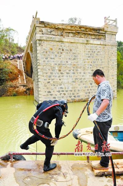 356省道白盆珠旱坑大桥70米的桥面坍塌。小图为广州潜水员下水底寻人。南方日报记者 梁维春 摄