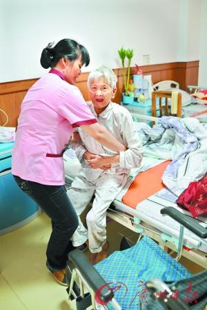 养老护理员龚艺红准备将一名行动不便的老人从床上抱到轮椅上外出散步。记者莫伟浓 摄