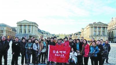 中老年户外活动群在凡尔赛宫前合影留念。