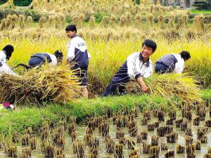 贵州雷山中学生志愿者帮农民割稻(图)