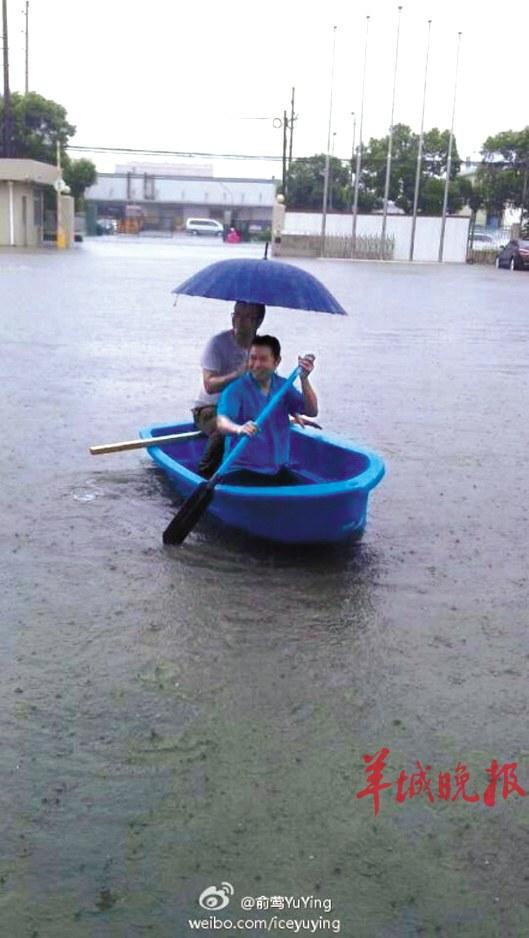 网友俞莺YuYing在微博发出图片,惊叹所在的公司已经被淹。“【让我们荡起双桨!!!】松江民益路沦陷!!!在公司的同事发来贺电!这船是我们公司的产品!厉害吧!看看工业区成啥了!!!”“我会告诉你我发这个图的时候心在滴血吗?我汽车被淹了。没买涉水险,保险不会赔”。