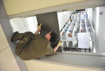9日晚11时许,工作人员在药房门口安装挡鼠板。