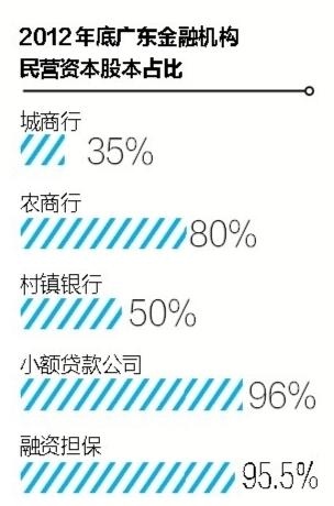 根据广东省金融办的统计数据,截至目前,我省民间资本在城商行、农商行、村镇银行总股本中的占比分别超过35%、80%和50%,全省大部分小额贷款公司和融资担保公司等准金融机构也均由民营资本投资设立。