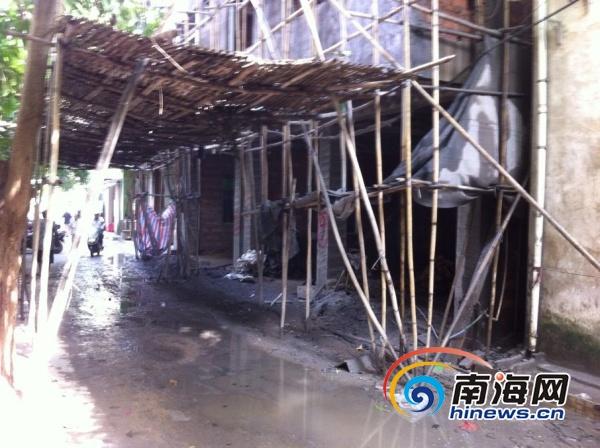 违建楼底搭起的简易竹棚,楼底污水横流(南海网记者高鹏摄)
