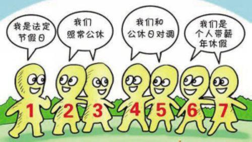 按照2007年《全国年节及纪念日放假办法》,中国全体公民放假的节日共11天,分别是元旦1天、春节3天、清明节1天、劳动节1天、端午节1天、中秋节1天、国庆节3天。现行放假调休方法通过调借双休日,分别形成2个7天“长假”(春节、国庆)和5个3天“小长假”(元旦、清明、五一、端午、中秋)。