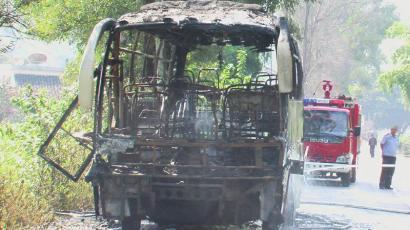 事发时,这辆客车行驶至宁南县松新镇罗家河坝一公里处,车尾部突然冒出浓烟,同时燃起大火。接到报警后,宁南消防大队立即赶往现场救援,当时车内共有27人已及时撤离,着火点位于客车尾部,由于车内易燃物品较多,车主报警晚,客车已处于猛烈燃烧阶段。起火的原因疑为机油管漏油,机油流至发动机高温部位引起。(邹增银 巫明杰 华西都市报记者 徐湘东 摄影报道)