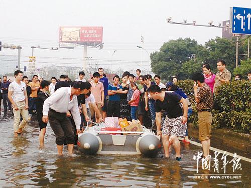 老人坐在充气的汽车内胎、小孩坐在大塑料盆、妇女坐在木板上被推出去,男人只穿内裤趟水的景象处处可见。各种求救信息,在网络上传播。